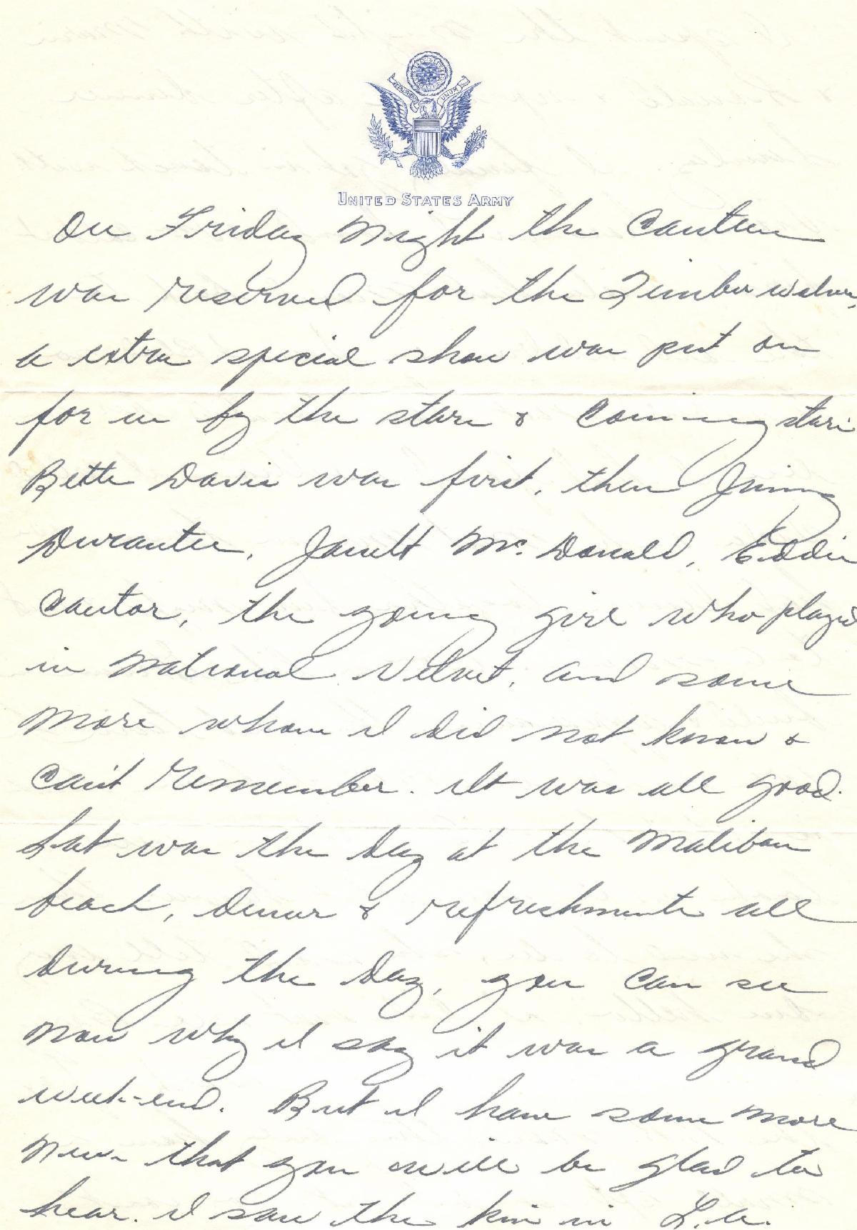 Interestingly, in his letter, he mentions seeing Bette Davis, Jimmy Durante, Jeanette McDonald, Eddie Cantor, and "the young girl who played in National Velvet." That young girl was actress Elizabeth Taylor.