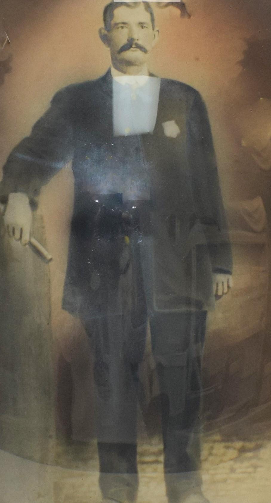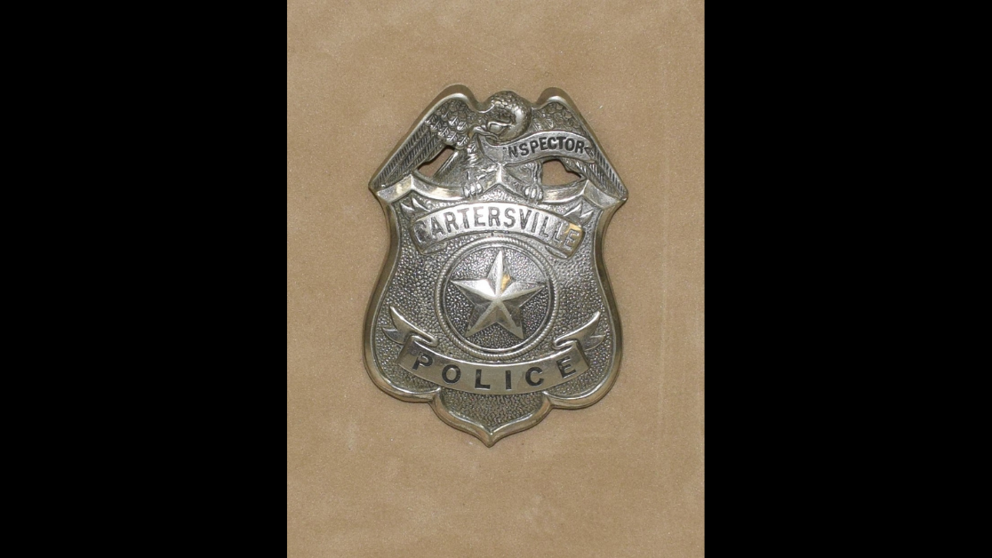 This badge was worn by Cartersville Police Inspector John Albert Spence. His portrait shows him in uniform wearing the badge. He died in 1929, and his obituary in the Tribune News stated, “He was the possessor of the happy faculty of making staunch friends of all with whom he came in contact, and he enjoyed the esteem of every citizen of the community.”