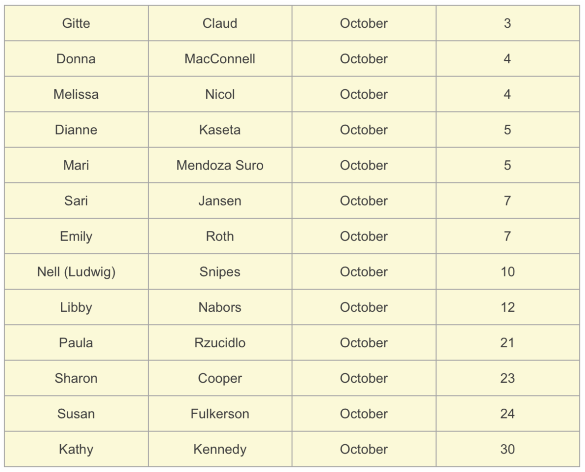 | | Celebrating You!!! Happy Birthday to our October birthdays! | | If you know of anyone that could use a little "Sunshine", please contact our ambassadors of sunshine, Kristine Ward and Debbie Judd. | | | | | |