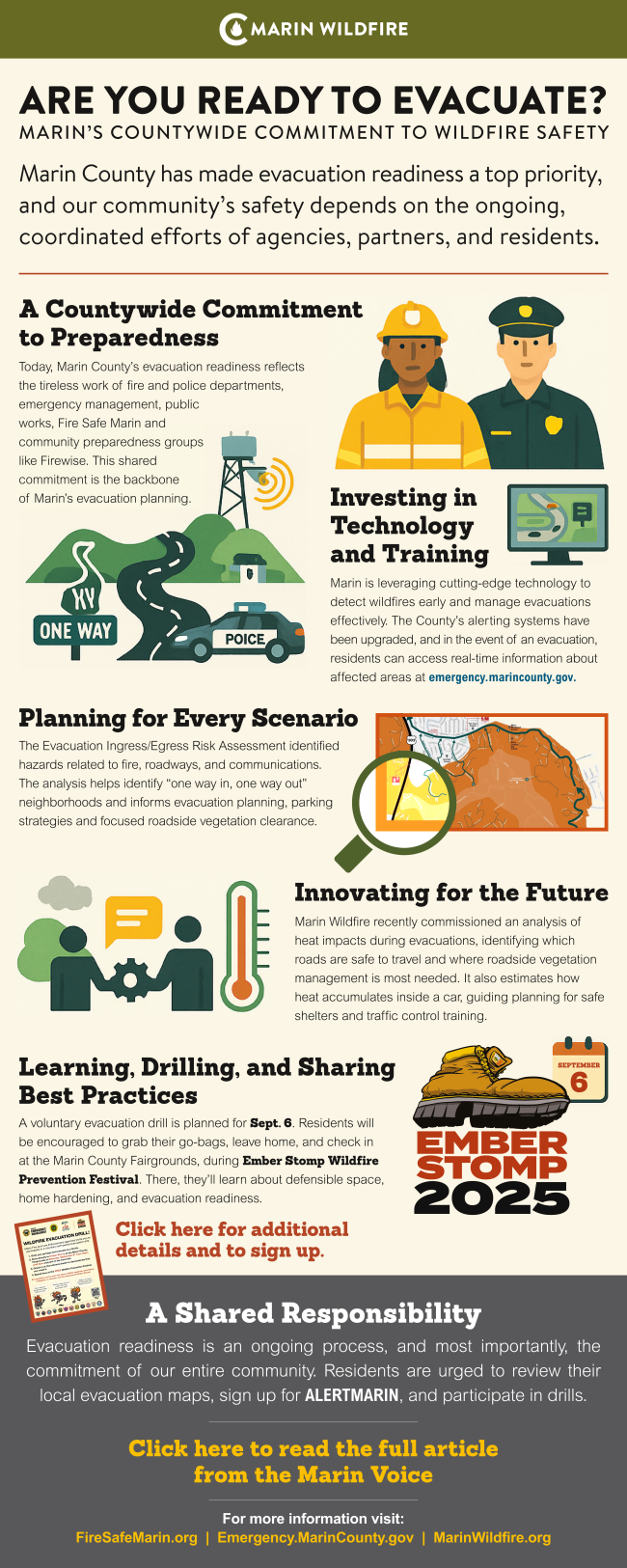 Marin County’s evacuation readiness is a priority that reflects the tireless work of fire and police departments, emergency management, public works, Fire Safe Marin and community preparedness groups like Firewise. This shared commitment is the backbone of Marin’s evacuation planning.
