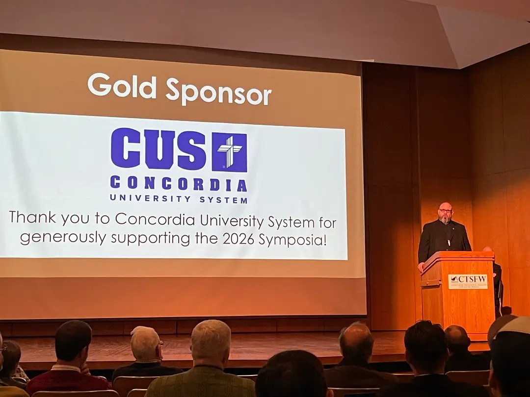 The Concordia University System was a gold-level sponsor of the January 20-23, 2026, Theological Symposia at Concordia Theological Seminary in Fort Wayne, Indiana. In addition to several CUS Theology Faculty members who were present and presented papers, CUS had a display booth in the main registration area, and Dr. Hardy delivered remarks to the assembly. CUS sponsors the symposia at both of our seminaries, the Higher Things, several LCMS District youth conferences, and "The Coffee Hour" on KFUO to promote LCMS higher education among our congregations, pastors, and youth. We will also have a large display at the upcoming LCMS Convention in Phoenix. When you see us at an event, stop by and say, "Hello!"