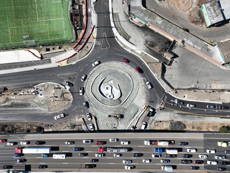 Aerial view of one of the I-80/Gilman Interchange Improvements Project roundabouts. | |
