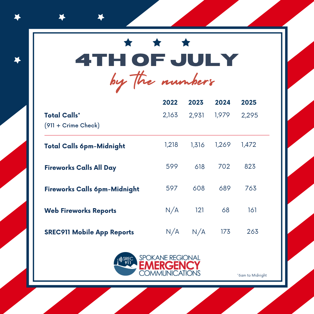 Between 6:00 a.m. and midnight on July 4th, Crime Check and 911 received 2,295 calls, with 823 related to fireworks. That total includes 424 reports submitted via our online and mobile reporting tools. These digital reports played a crucial role in helping us manage call volume and keep 911 lines open for true emergencies.
