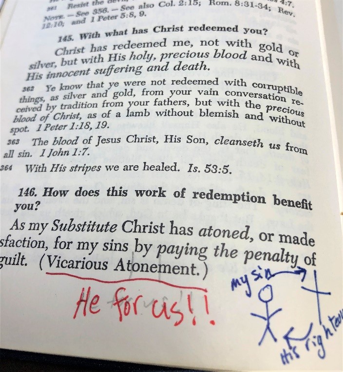 It didn’t take him long to do it again. Pastor emphasized again the poor, miserable sinners that we 7th and 8th graders truly were. And then, he laid it on us – the beautiful Good News of the Great Exchange. Jesus for us. In exchange for our sin, we get His forgiveness and His righteousness. It looks something like this in my 1943 Small Catechism: