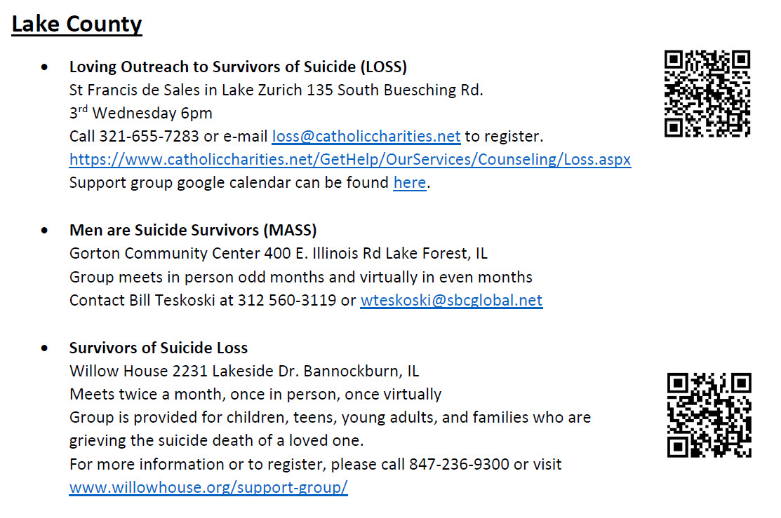 If you are struggling with the loss of a loved one due to suicide, this is a list of support groups in Lake County that you might wish to contact.