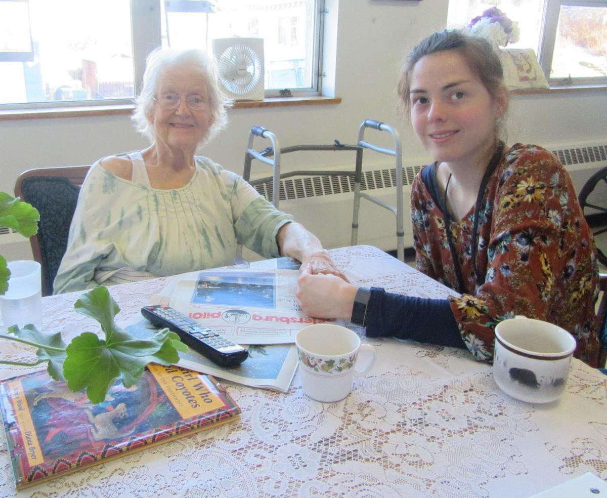 ▲ LTC resident Carol Wallace visits with Noelle McPherson, Activities assistant.