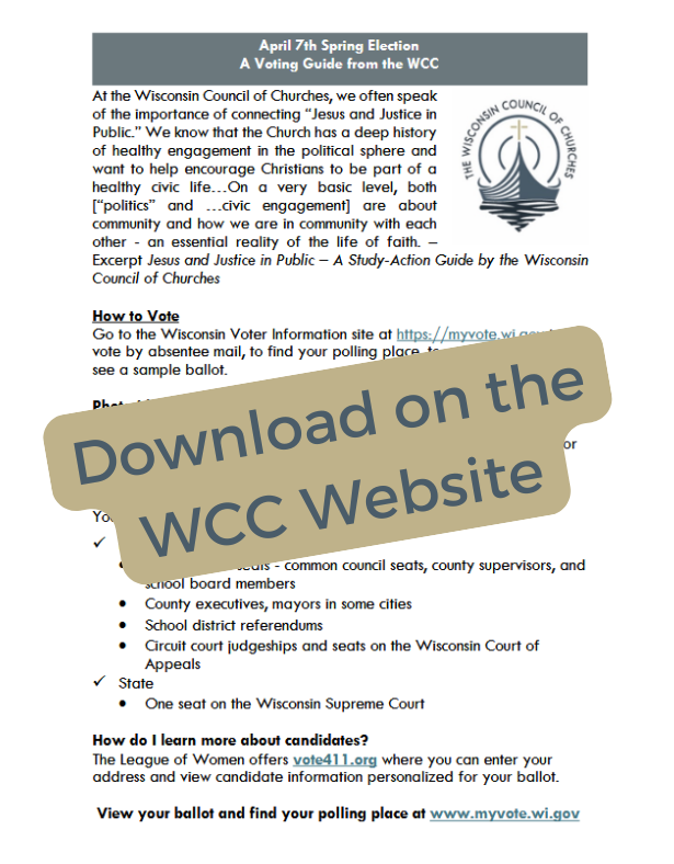 Wisconsin's Spring Elections day this year is Tuesday, April 7th. The Wisconsin Council of Churches has developed a bulletin insert with general information on voting, what might be on your ballot, and links to learn about candidates.