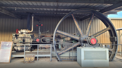 The 24-foot-long Bates-Corliss engine and its boiler weigh 125,000 pounds. Its eight-spoke flywheel, 15 feet in diameter and 30 inches wide, is 32,000 pounds of cast iron in two parts. Runs at 350 horsepower and was the companys primary power source until it was abandoned in 1938.