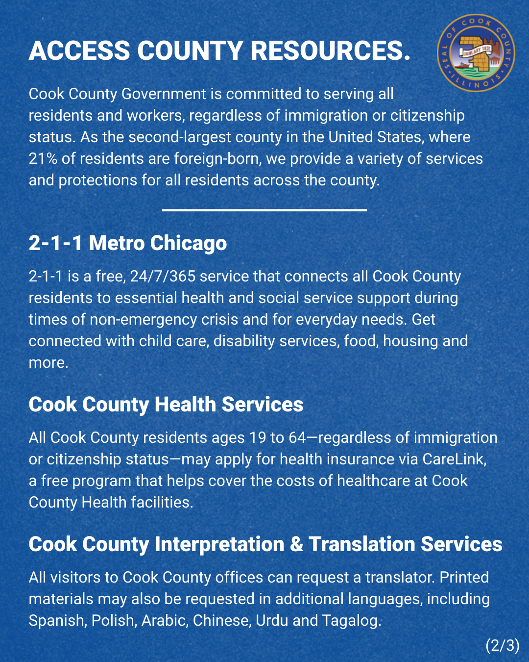 Cook County is a Welcoming County, and residents should feel safe accessing health care, schools, or the courts without fear. If approached by ICE, individuals are reminded not to open their doors unless a warrant signed by a judge is presented. People have the right to remain silent, the right to contact an attorney, and the right to make a phone call. A 24-hour hotline is available for those needing assistance: 855-435-7693.