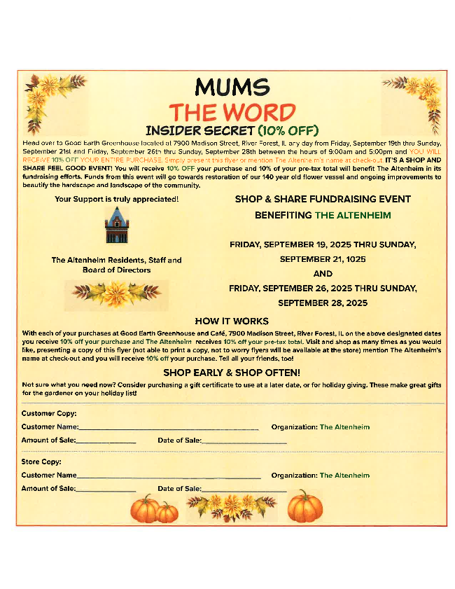With every purchase, you’ll receive 10% off, and The Altenheim will also receive 10% of your pre-tax total. 💐 A simple way to save while giving back!