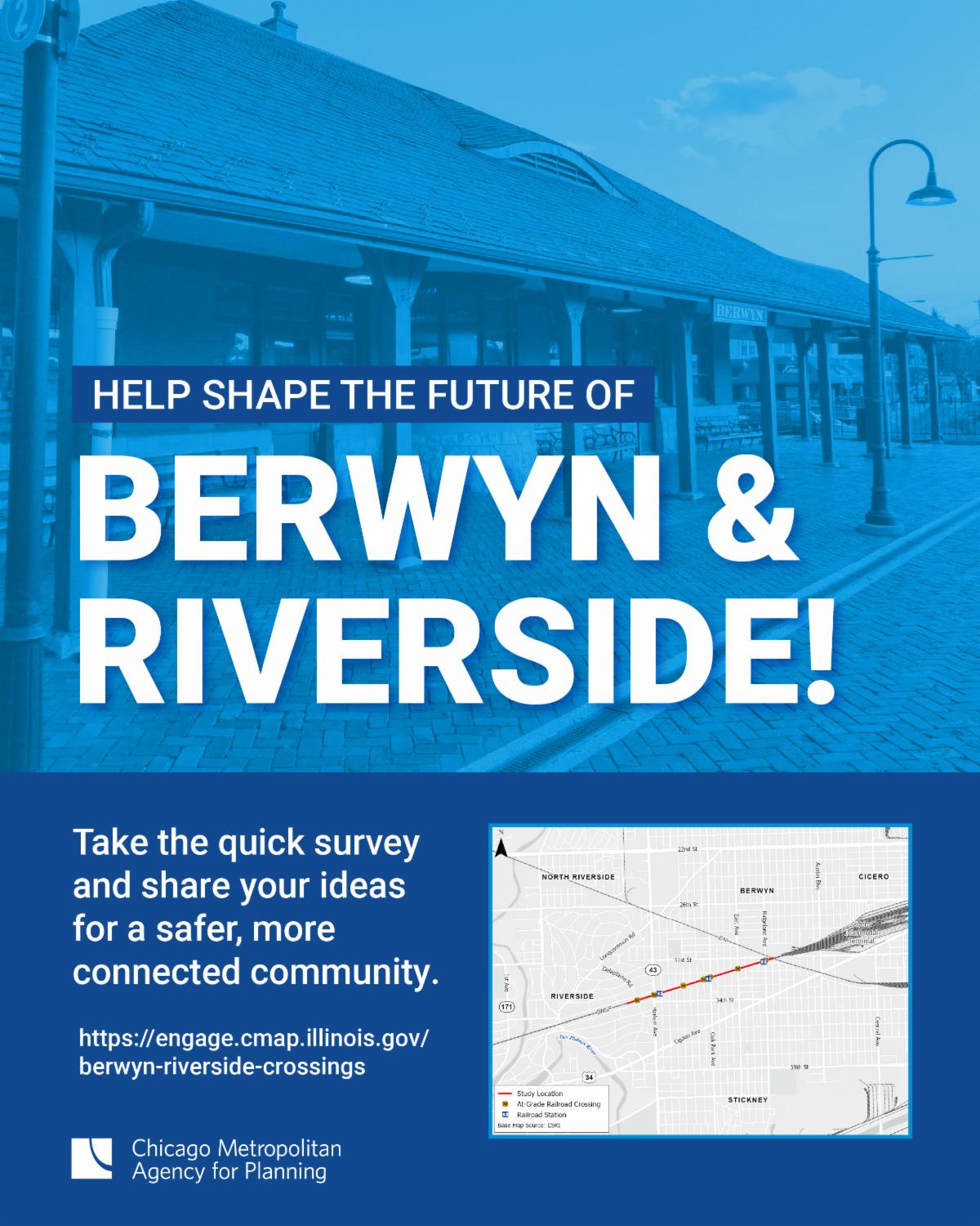 The Chicago Metropolitan Agency for Planning (CMAP) is working with local communities to improve safety and access at railway crossings, and your voice matters! Whether you're a resident, commuter, or business owner, please take a couple of minutes to complete the community survey. Your input will help guide decisions that impact travel, emergency access, and pedestrian safety. Help us build a safer, more connected community! Take the survey now at: https://engage.cmap.illinois.gov/berwyn-riverside-crossings.