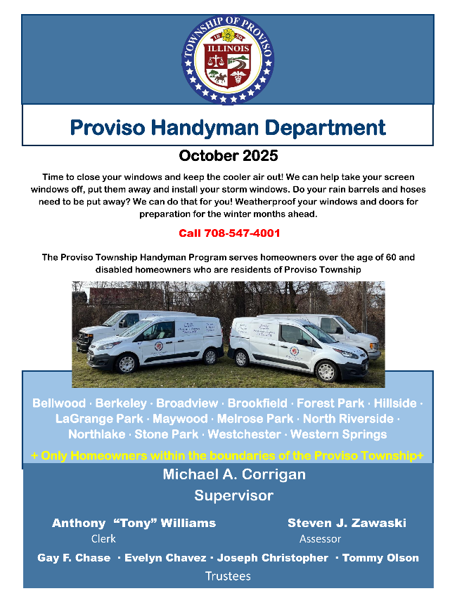 Proviso Handyman department is here to serve the needs of our senior residents over the age of 60 and /or disabled residents who are homeowners in our community.