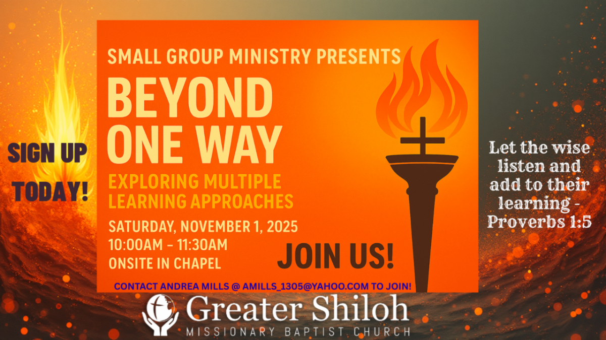 Attention all facilitators!" Looking for fresh ways to engage every learner in your group? In this seminar, you’ll discover simple strategies to show “why” content matters, “what” the Bible teaches, and “how” to apply it in real life, It's happening tomorrow, November 1, 2025, from 10:00 a.m. to 11:30a.m. in the Chapel. Walk away with practical tools to spark discussion, inspire reflection, and create meaningful learning experiences that reach every participant. Don’t miss it! Please contact Sis. Andrea Mills at amills_1305@yahoo.com for any questions. |
