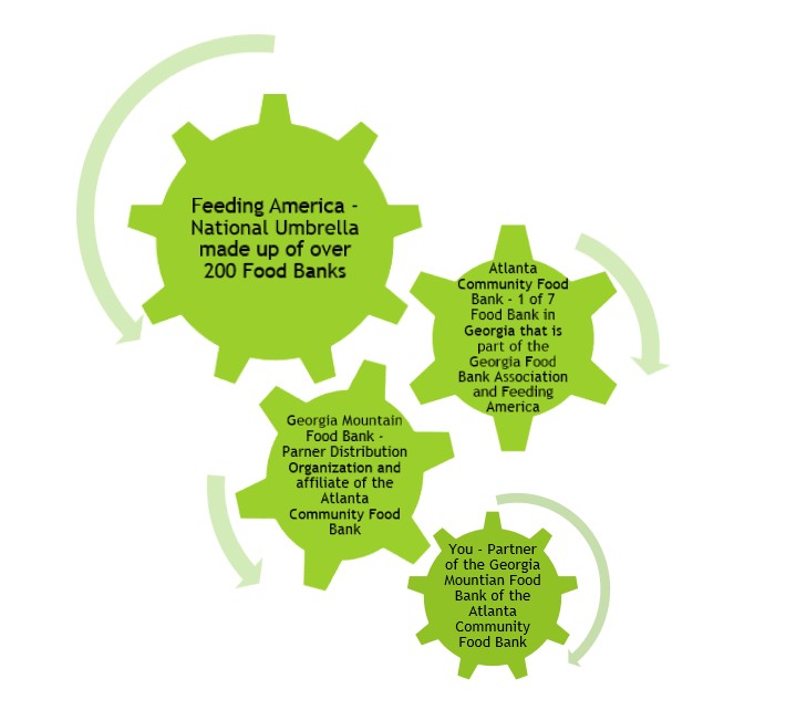 You, our Partner Agencies are the boots on the ground! You work directly with your neighbors that need help with food. You stock your shelves with donations, and by partnering with the Georgia Mountain Food Bank, and gain access to ACFB inventory as well. Some of you pick up food directly from a retail store assigned to you as part of the Retail Enablement Program. All of this is a finely fitted system making up a perfect partnership!