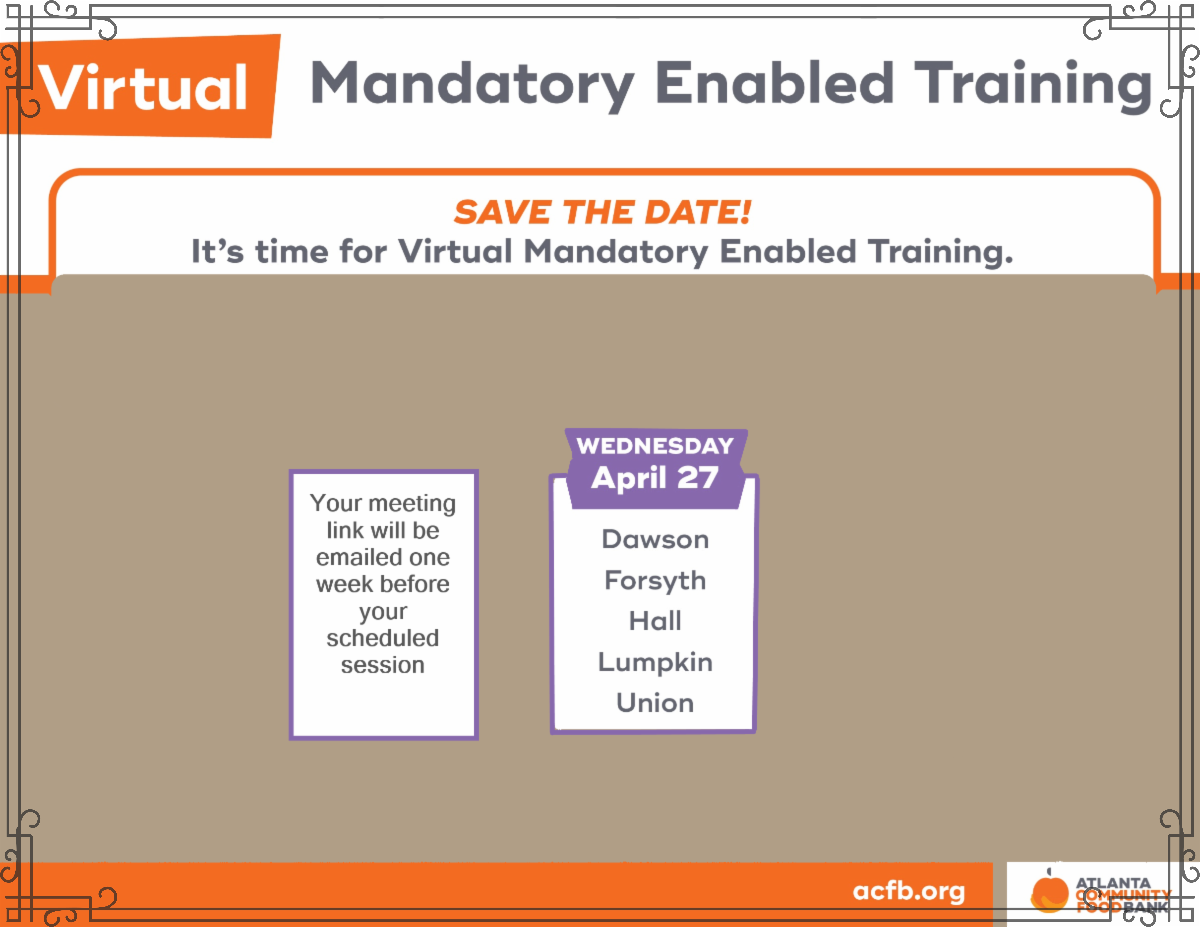 The Atlanta Community Food Bank is our affiliate and is a member of the Feeding America network. A food bank acts primarily as a warehouse distribution hub for nonprofit feeding organizations. Partner Agencies, such as yours, have access to their inventory and if they are also an enabled agency, has access to food directly from a local retail store participating in the Retail Enablement Program. ACFB also offers USDA commodities and GNAP products through their inventory as well.