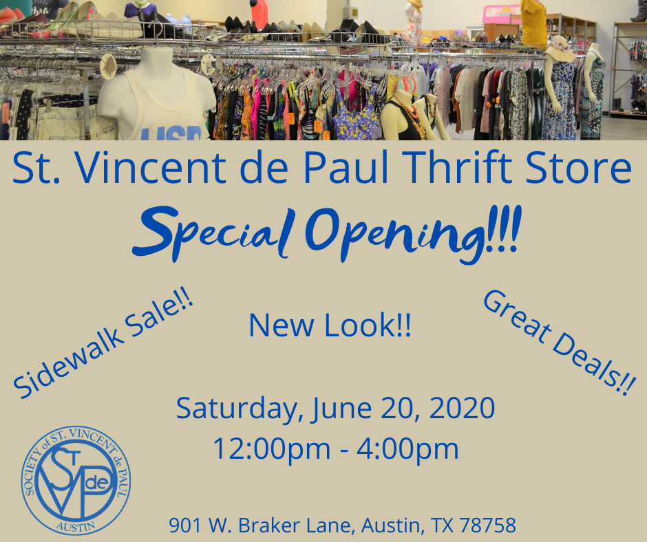 We are excited to announce that the St. Vincent de Paul Thrift Store will have a special opening Saturday, June 20, 2020 from 12:00pm to 4:00pm. You are invited to come out and check out our new look and take advantage of some great deals! Staff, volunteers, and customers are required to wear face coverings to keep everyone safe.