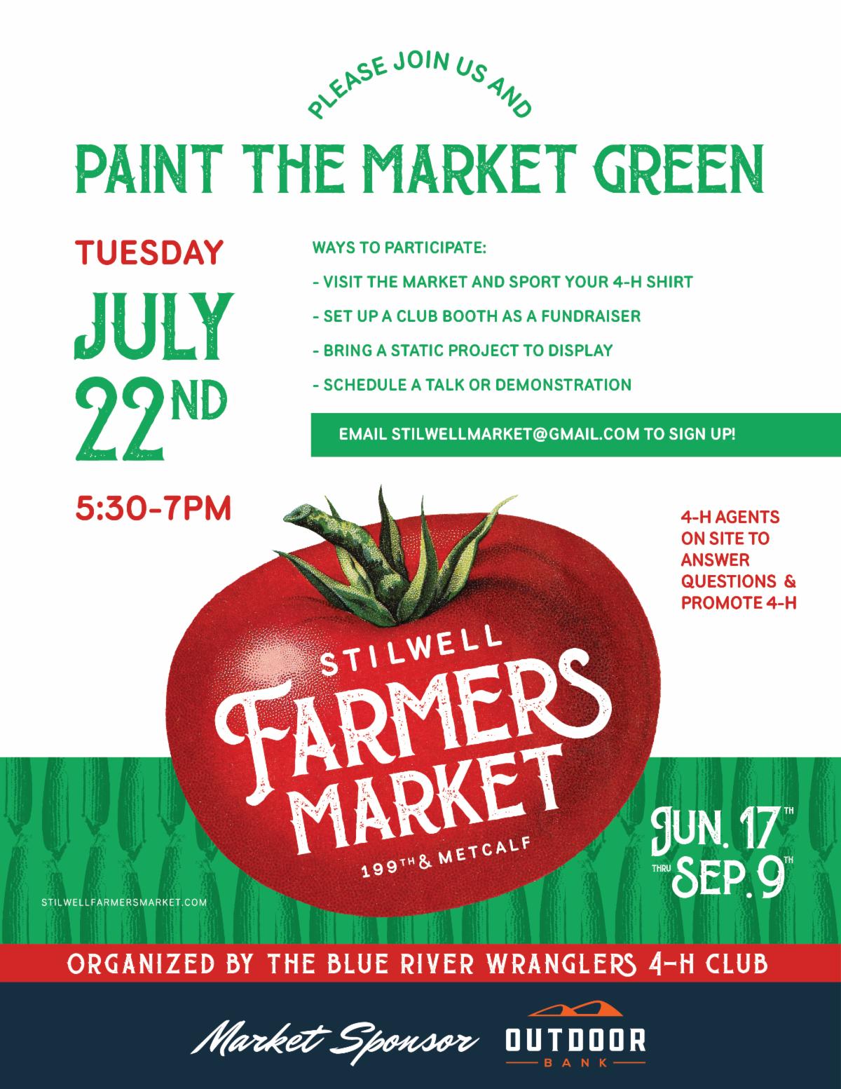 The Blue River Wranglers are proud to present the Stilwell Farmers Market Tuesdays from 5:30-7pm at 199th & Metcalf in Stilwell, KS. We have scheduled a special night, July 22nd, for 4-H. We are inviting all 4-H'ers in Johnson and Miami County to come out and Paint the Market Green!