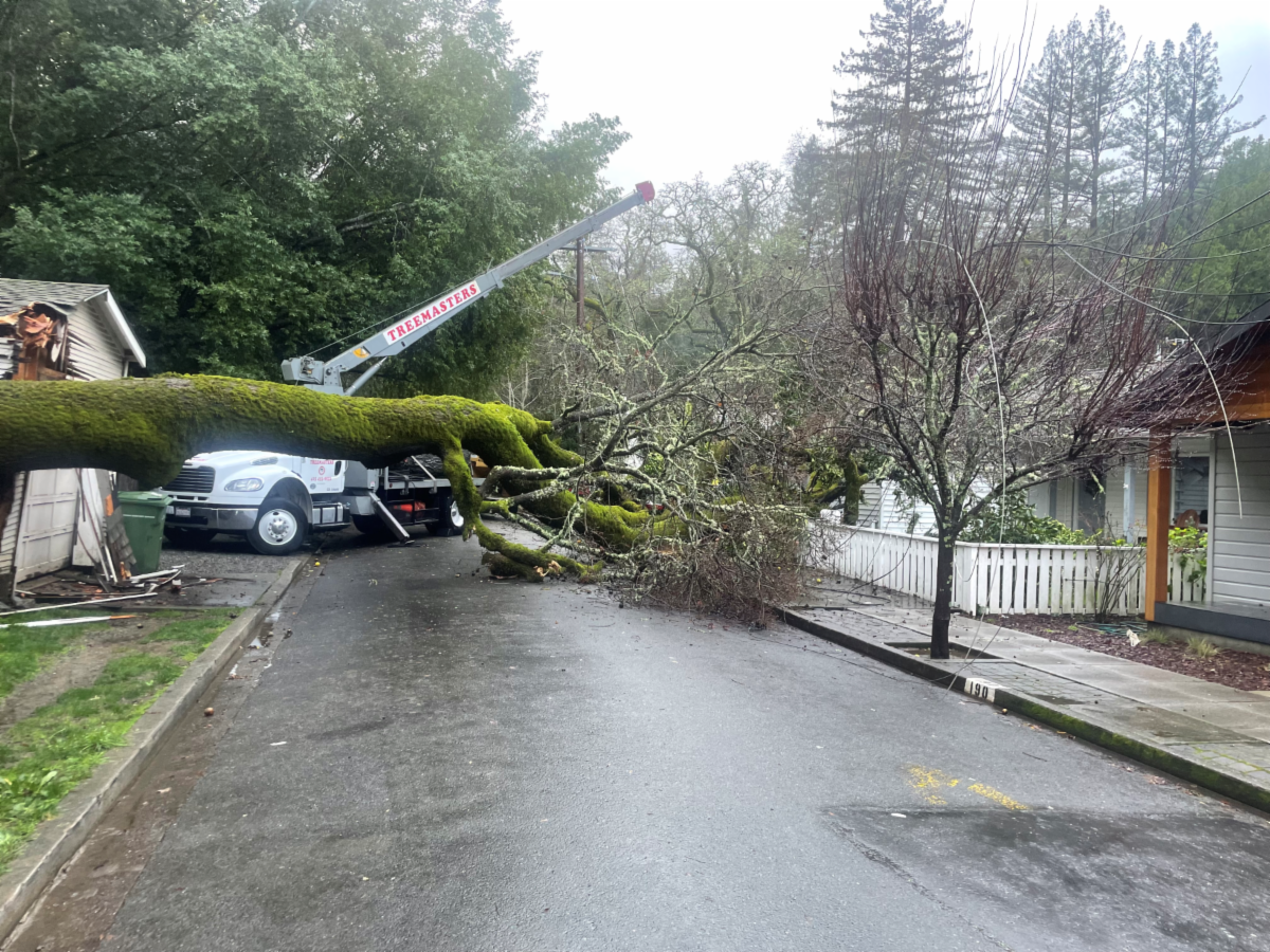 Late Sunday evening a large tree fell, taking down power lines down with it. Pacific Gas & Electric was dispatched to manage the knocked down power lines and work to restore power while Police and Public Works crews worked together through the night and Monday to clear the roadway.
