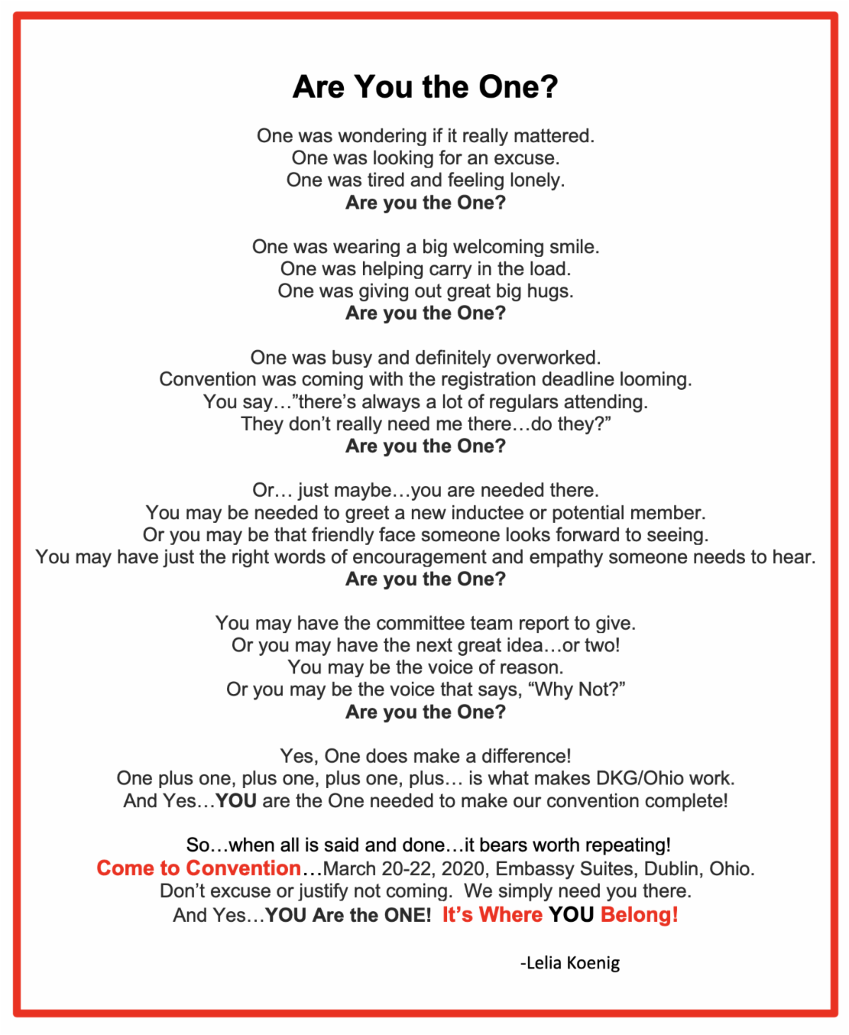 For those of you who have already registered for the convention and booked your room at the Embassy Suites…YAY!!! I look forward to seeing you there. For those of you who have not yet made that commitment, I would like to share the poem below by Leila Koenig, DKG Colorado State President…with a few poetic modifications from our own State President, Diana Kirkpatrick.