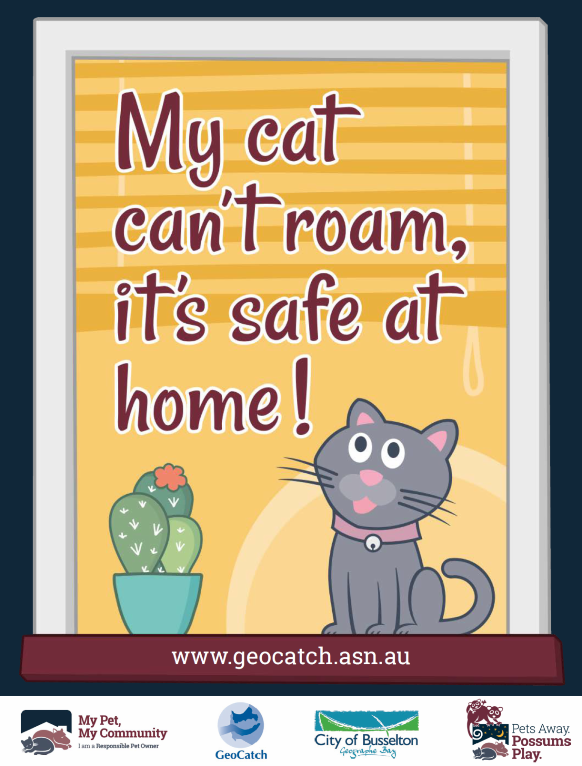 Did you know you can grab free 'Pets Away Possums Play' and ‘My cat can’t roam, it's safe at home' bin stickers from the GeoCatch office in Busselton?