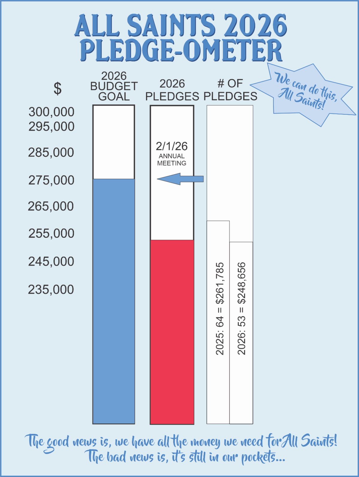 We’re trying to wrap up our 2025 Stewardship Campaign. The Vestry looked at our needs and set a goal to raise $275,000 in pledges for 2026. As you can see, we are getting close, but still short of our goal by about $27,000. We would sure like to present a balanced budget to the Parish at our upcoming annual meeting. If you have not yet pledged, please prayerfully consider it. There are always pledge cards in the back of the church, or you can go online at https://allsaints1692.org/support-us/annual-stewardship/