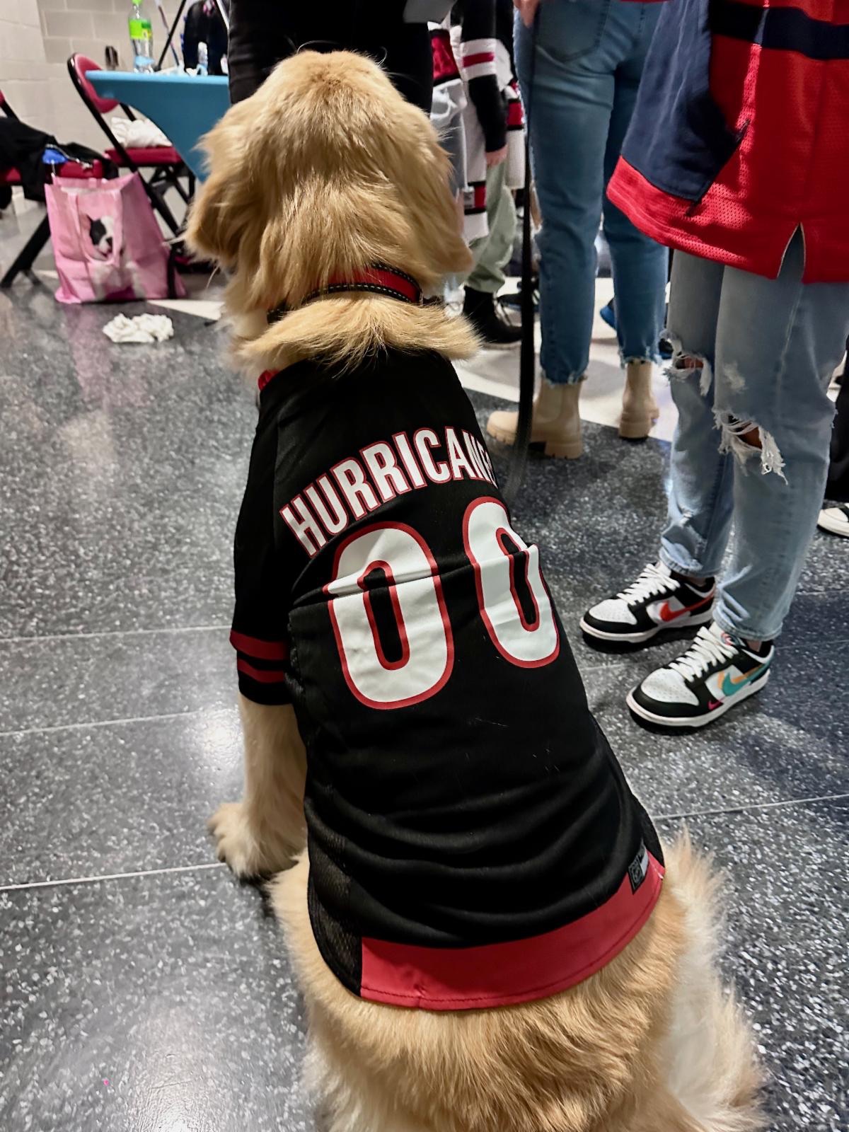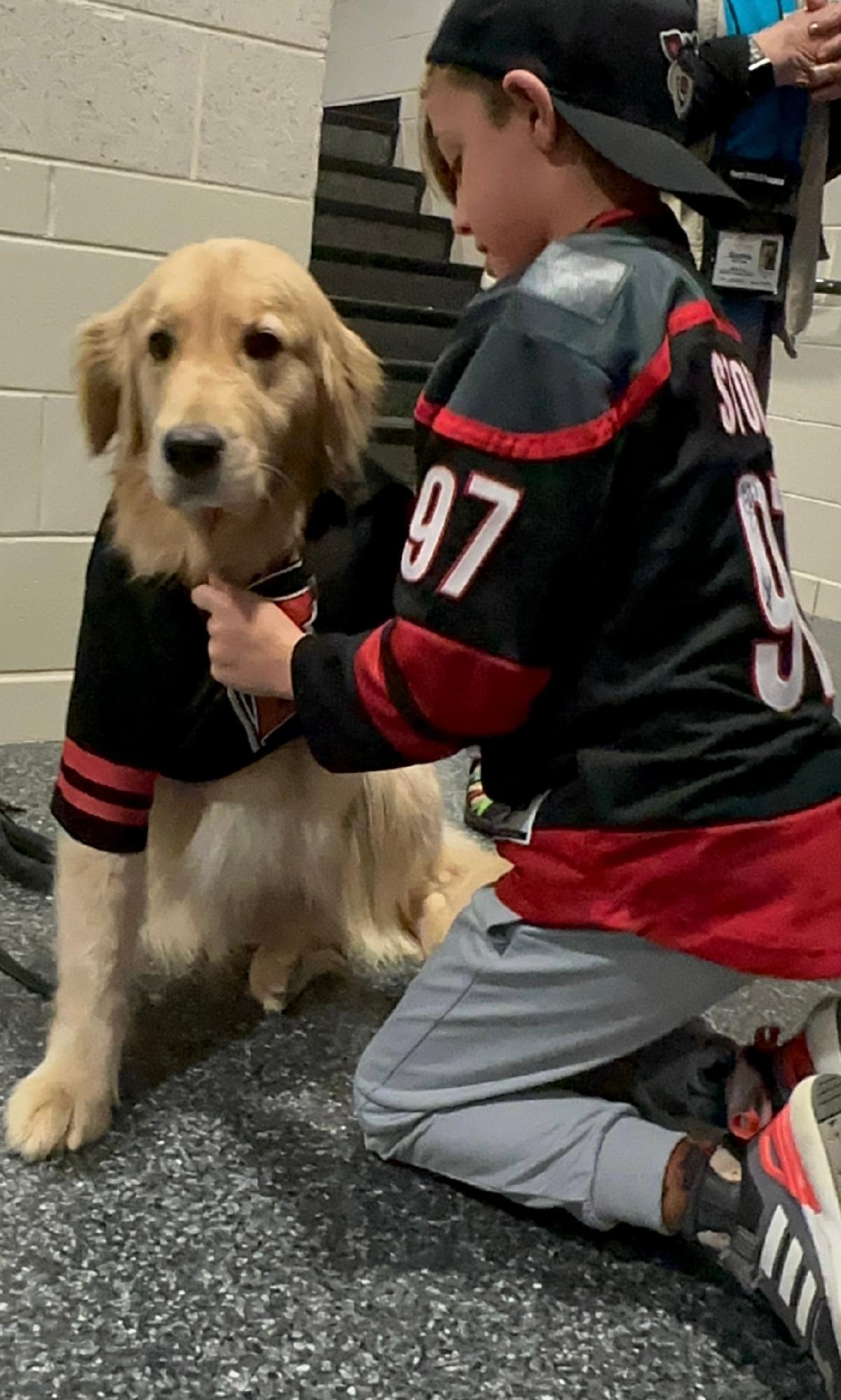 Sophie made a friend at the game with this young man. The dad was so taken by their instant friendship that he treated Sophie with a Hurricanes Jersey. Sophie was so patient while the young man tackled pulling it over her head and helping to pull her legs through the arm openings.