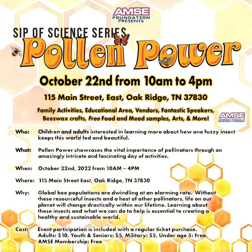 Introducing our recurring Sip of Science series which this time is all about Pollen Power. Showcasing one of the world’s most valuable and endangered class of animals: Pollinators! We will feature fantastic hands-on activities for all ages, guest speakers, vendors, foods, a few surprises, and so much more all designed to expand awareness of the amazing little critters that are responsible for nearly one third of the planet's food supply! | |