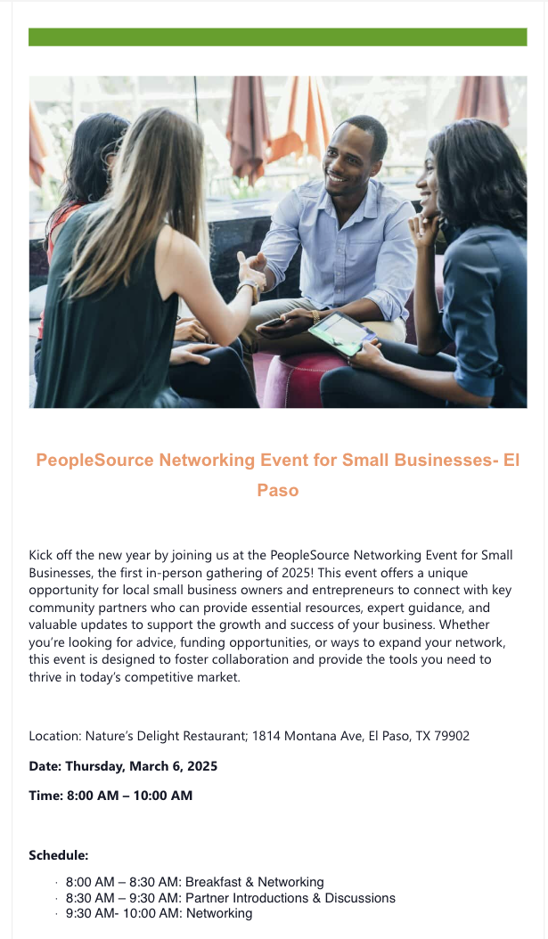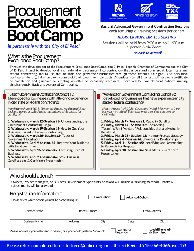 The El Paso Hispanic Chamber of Commerce (EPHCC), in partnership with the City of El Paso, introduced the Procurement Excellence Bootcamp Academy, a program designed to help both startup and expanding businesses navigate the bidding and contracting process. Borderplex Community Capital (BCC) provided an overview of their small business loan programs, highlighting available funding opportunities and technical support services for local entrepreneurs. Workforce Solutions Borderplex (WSB) closed out our meeting by sharing updates on their latest local business initiatives.