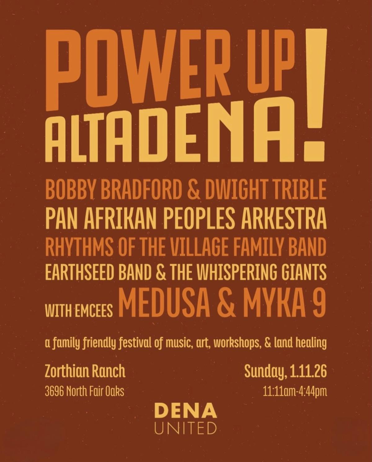 Soul Force Project Presents Power Up Altadena! (1/11/2026) | | Soul Force Project is an Altadena-based nonprofit and community of artists practicing global music to promote change and social justice. This January, join Soul Force Project for Power Up Altadena!, a healing day of community filled with live world music, jazz, and hip-hop, workshops, food, and local vendors. This family-friendly event is free for all Altadena residents and will give back to revitalizing the cultural community of Altadena. | | | | | |