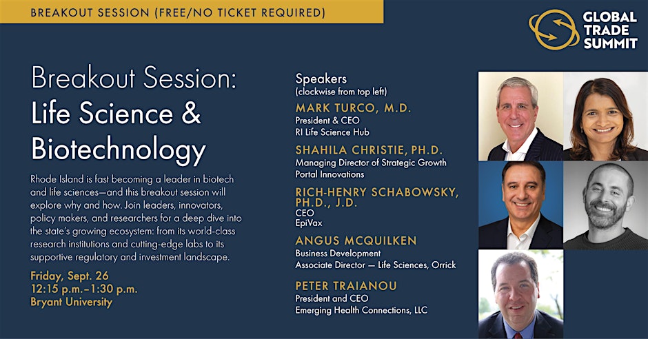 Join us as Mark Turco, CEO of the Rhode Island Life Science Hub, leads a dynamic panel with Shahila Christie of Portal Innovations on how startups and innovation hubs are shaping Rhode Island’s role in global trade. The summit will conclude with closing remarks and a networking reception.