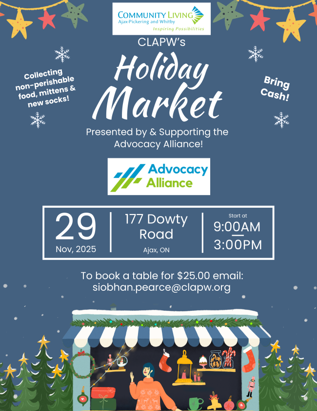 The advocates have been actively involved in various community projects, with more to come. On October 21, we participated in the Town of Ajax Halloween Pumpkin Giveaway, handing out candy to children. We also organize dances for Community Living, setting up decorations, running the events, collecting funds, and distributing drinks and snacks—ensuring everyone can enjoy themselves, regardless of mobility. On November 29, the advocates will host our Christmas Market for the second year, featuring a variety of vendors.