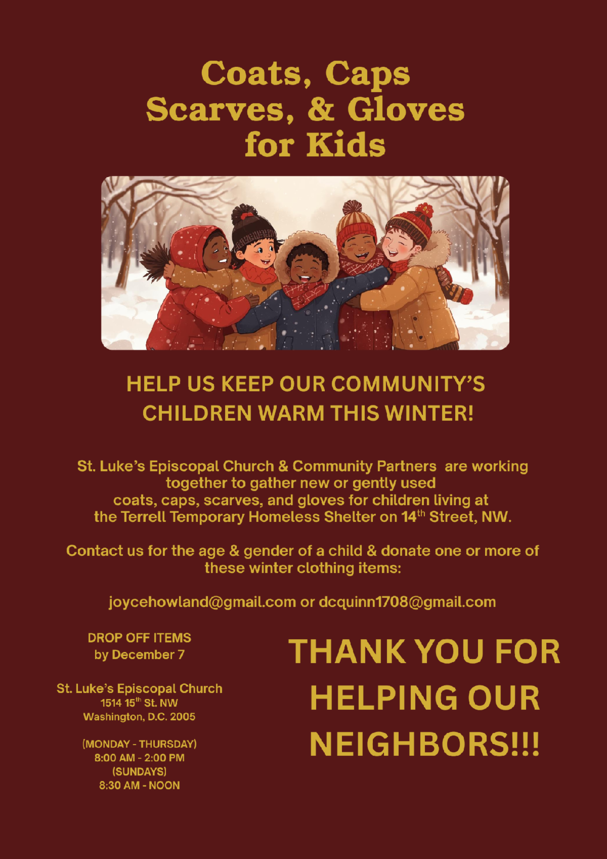 - Endure Together: Join with others at St. Luke’s in acts of compassion—support our coat drive, visit a neighbor, or volunteer with our community ministries.
