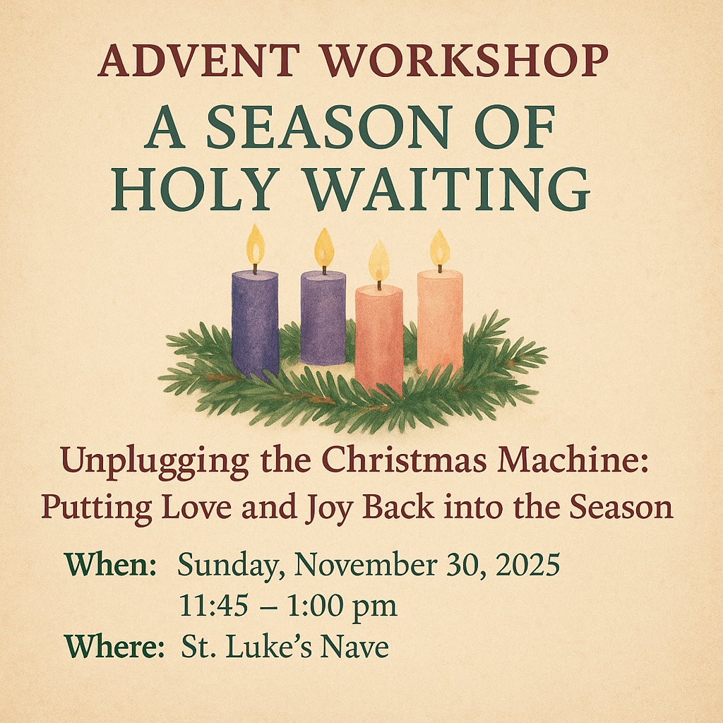 Drawing on Scripture, tradition, and symbols like candles, wreaths, and evergreens, we’ll explore the rich history and spiritual themes of Advent, Hope, Peace, Joy, and Love. Each participant will receive An Advent Book of Reflections created for St. Luke’s, filled with weekly meditations and simple daily practices to bring more depth and peace to the season.