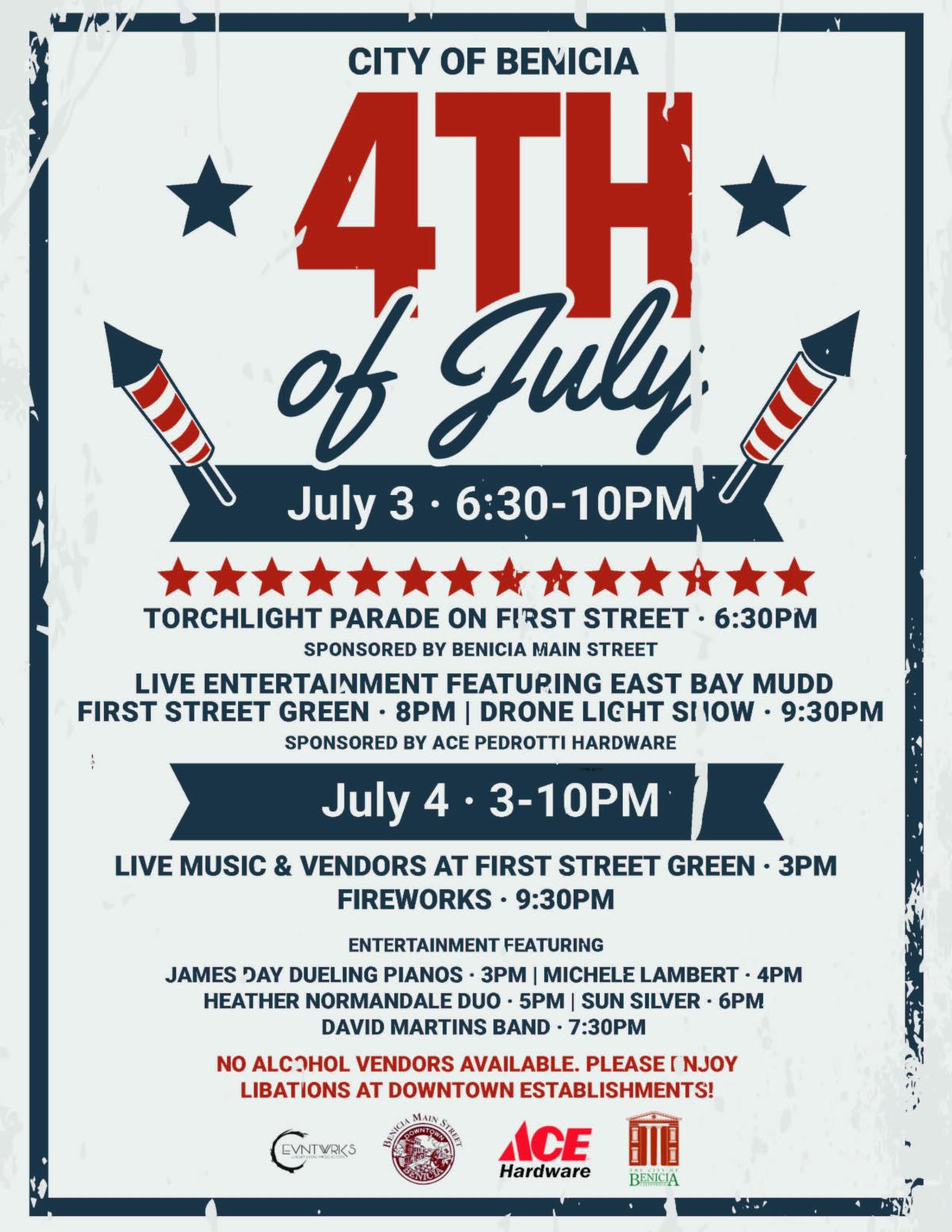Make plans to celebrate the 3rd & 4th of July in downtown Benicia and support downtown restaurants and retailer while you're there. Parking will be limited. Consider using Uber or Lyft.