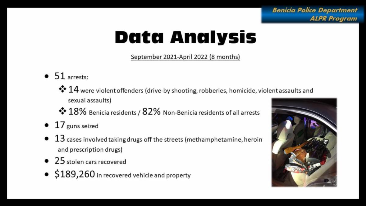 Below is a slide highlighting data on the arrests that have been made as of April 29 with the assistance of this system.