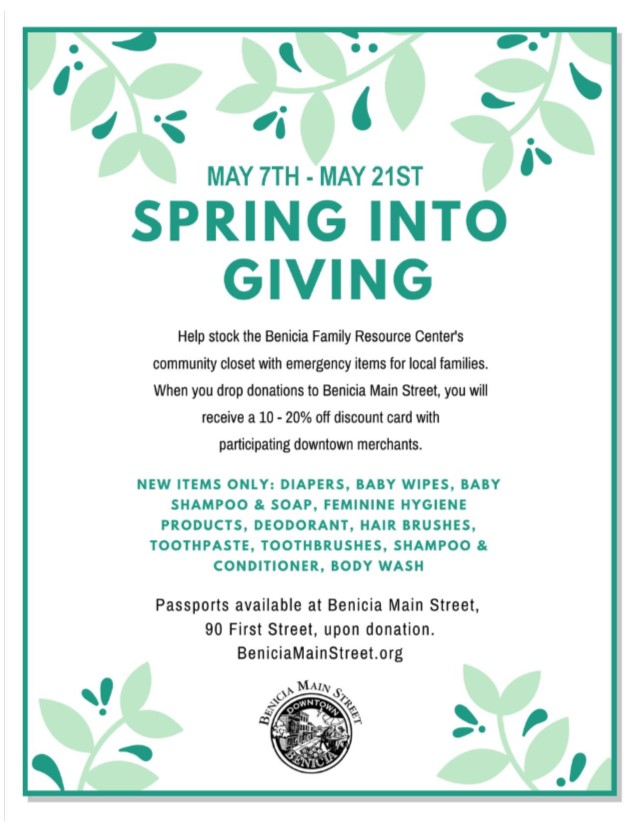 Donate to Benicia Police Department's Family Resource Center Community Closet through Benicia Main Street and you can get a discount card to Benicia merchants. Donations are accepted through Saturday, May 21.
