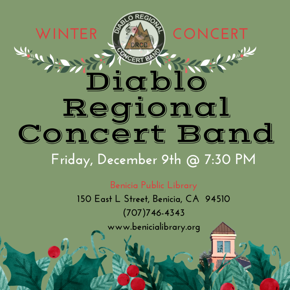 Cozy up next to the fireplace at the Benicia Public Library and listen to live holiday music. The Diablo Regional Concert Band's Winter Concert will be held on Friday, December 9th at 7:30pm in the fireplace area of the Benicia Public Library. This is a free concert of lively holiday music and appropriate for all ages!