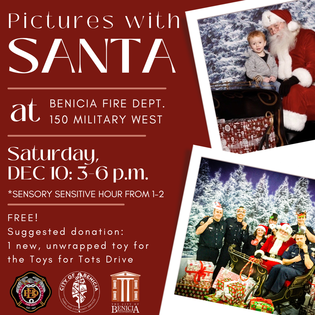 Benicia Fire Department and Benicia Parks & Community Services are excited to welcome Santa Claus! Join us as Santa takes time out of his busy December schedule to stop by Fire Station 11 on Saturday, December 10th from 3-6pm. Fire Station 11 is located at 150 Military West. This event is free and open to the public. There is a suggested donation of a toy for our Toys for Tots drive. All toys must be new and unwrapped.