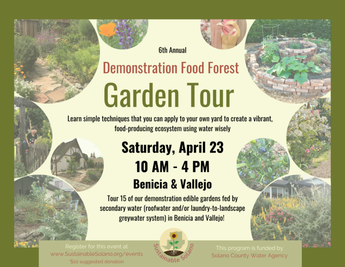 Have you ever seen a food forest? Are you interested in growing your own food or want to replace your lawn with a more sustainable landscape? Sustainable Solano's Annual Food Forest Tour is back! Do not miss out on the chance to tour demonstration edible gardens fed by secondary water (roofwater and/or laundry-to-landscape greywater system) in Benicia and Vallejo!