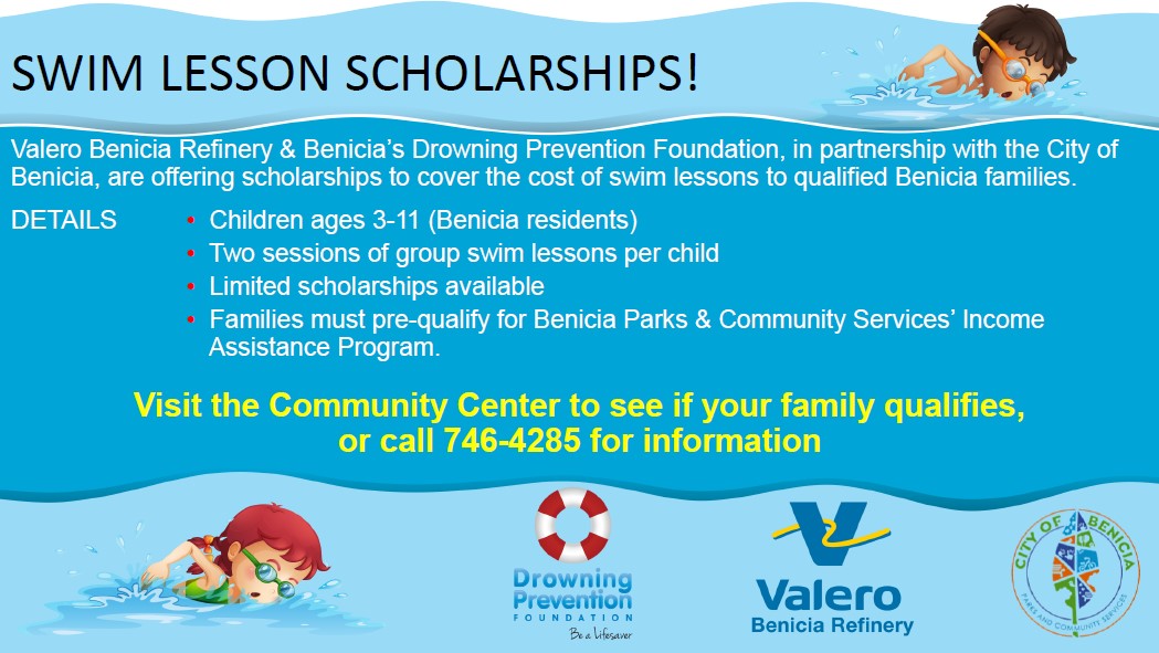 Thanks to the Drowning Prevention Foundation, in partnership with Valero Benicia Refinery, the Parks & Community Services Department received a generous donation for scholarships for qualifying Benicia children allowing for two free group swim lessons.