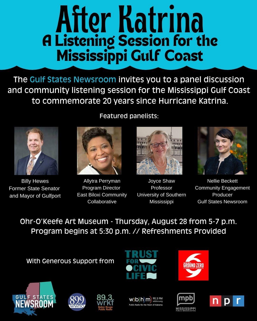 - After Katrina: A Listening Session for the MS Gulf Coast at the Ohr-O’Keefe Museum of Art (Biloxi) Thursday, August 28 @ 5:00 pm - 7:30 pm