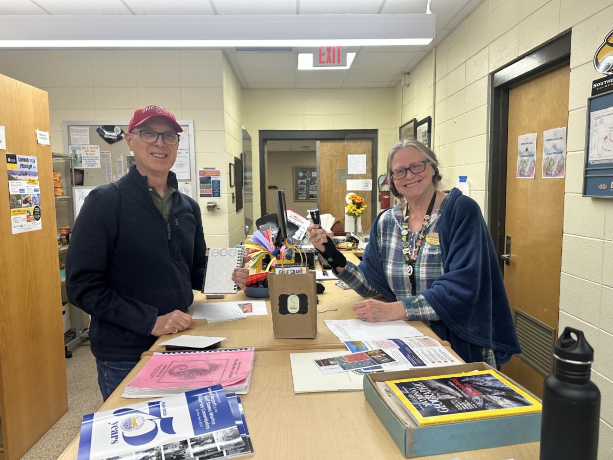 | On Monday, November 10, Joe Petronie of Dallas, TX, stopped by the service desk at Gunter Library and became our first visitor wanting his Mississippi Gulf Coast National Heritage Area passport stamped. He is shown here with librarian, Joyce Shaw. He was traveling to Florida to celebrate his father’s 97th birthday. | | |