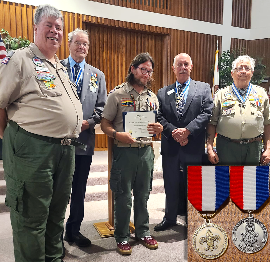 VPG Brown and Bill Nay (right) were joined by Scouts BSA Redwood Empire Council Scout Executive Charles Howard-Gibbon (left) and Bill Van Valkenburg as they presented Mike Nay (center) with the SAR Robert E. Burt Scout Volunteer Medal and the Eagle Scholarship Fund Medal (inset). | |