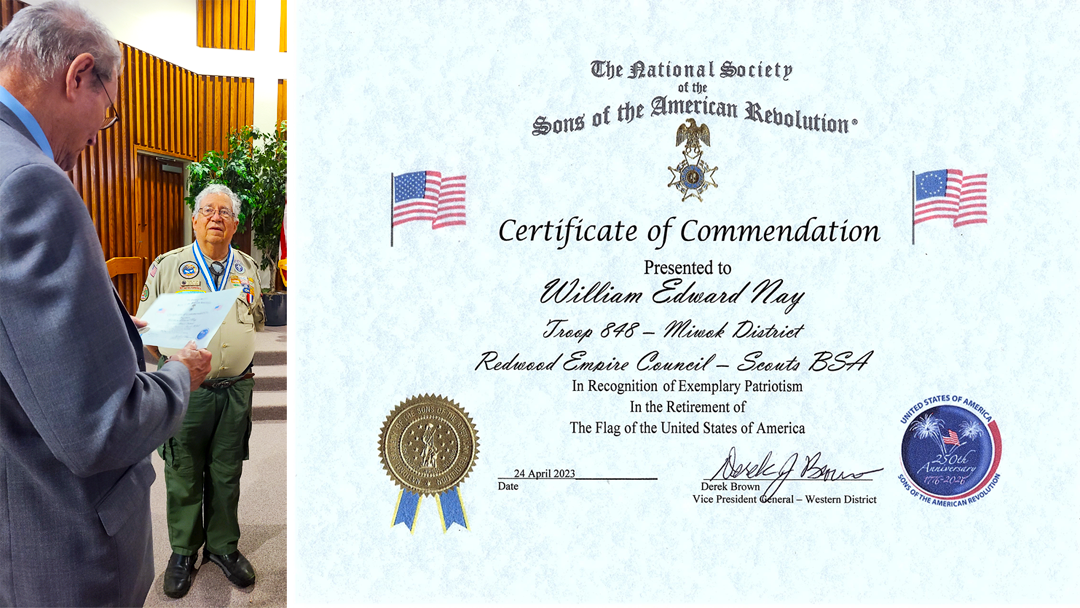 Derek Brown, Vice President General, Western District, National Society SAR attended and presented the Troop with certificates for their dedication and service in the Retirement of 66 U.S. Flags. | |