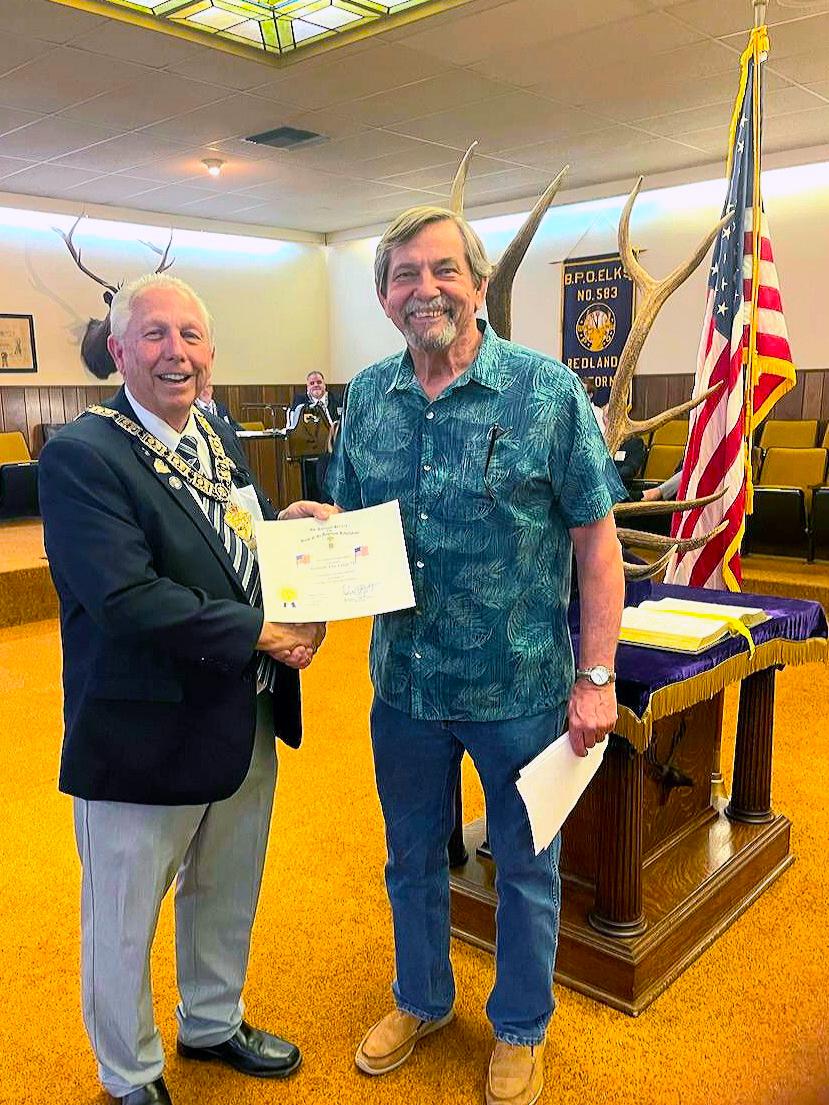 Redlands Chapter made a huge effort in April by presenting 3 flag certificates. Pictured is Don Boatright presenting an SAR Flag Certificate to the representative of Elks Lodge Redlands 583. As of now Redlands is almost averaging 1 certificate/month. Way to go Redlands! | |