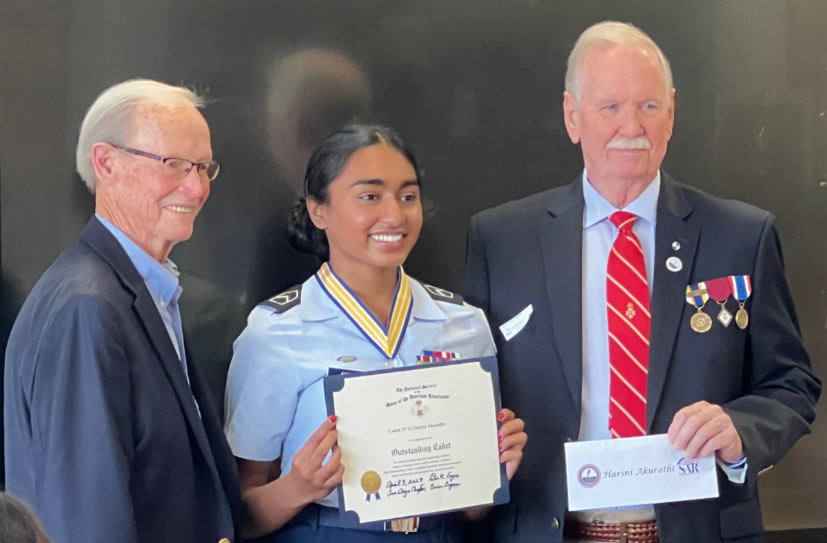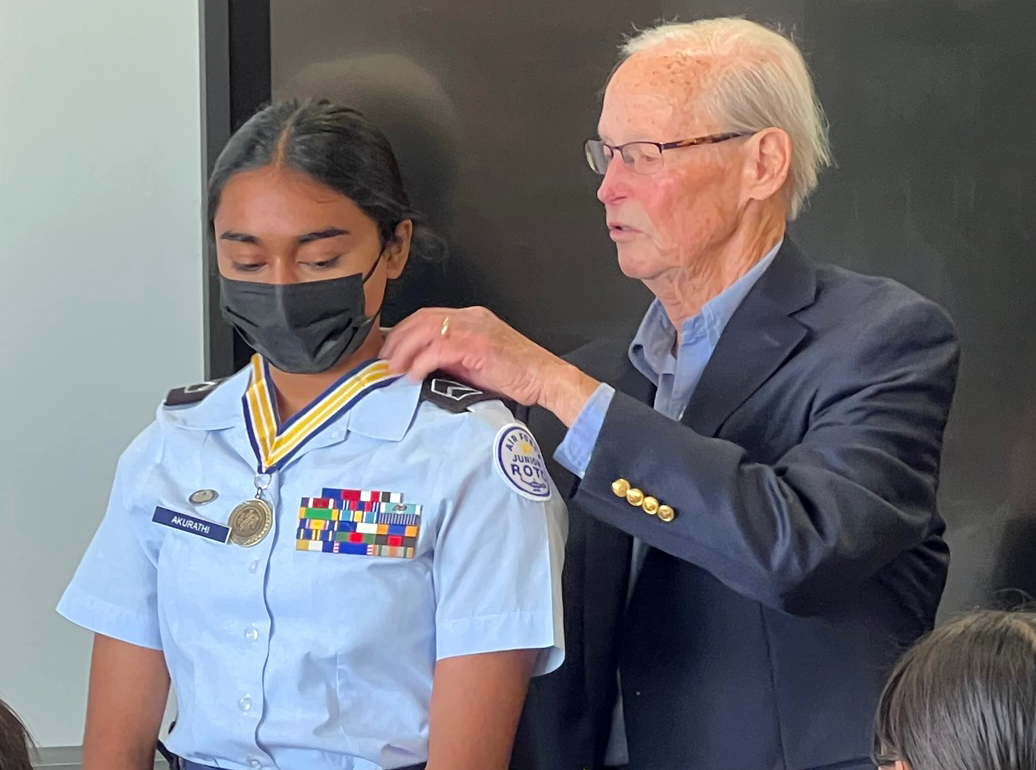 Harini Akurathi of the Scripps Ranch High School was presented the San Diego Chapter's Junior ROTC Enhanced award for 2023 by our Sargent-at-Arms, Gary Newton. The award ceremony was conducted on April 3 at the Scripps Ranch High School's ROTC facility in front of an assembly of JROTC students. | |
