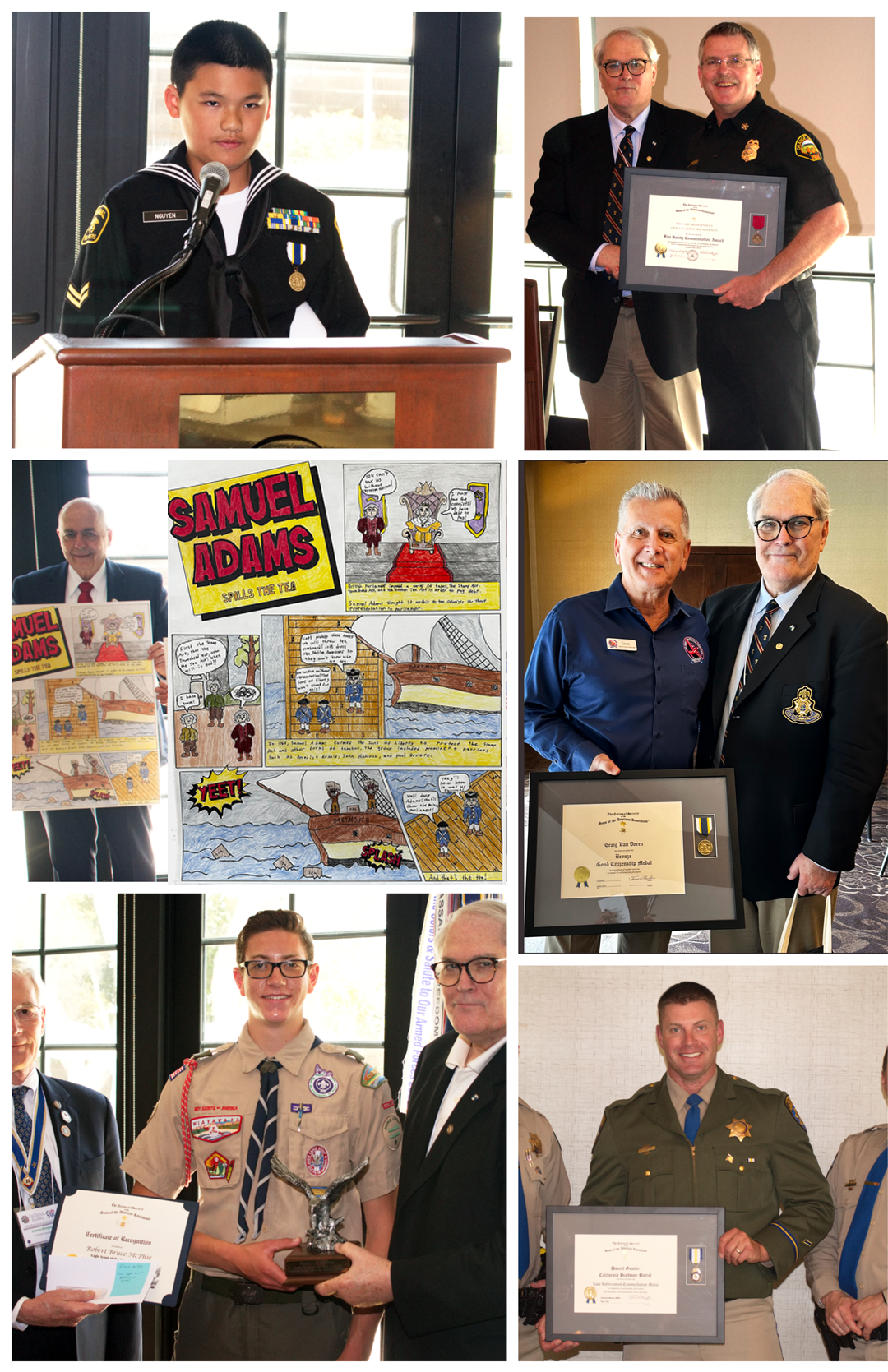 We also honored our Youth Contest winners and Public Service employees at their respective luncheons. Our Public Service honorees were: Chief Brian Fennessy of the Orange County Fire Authority, Officer Daniel Gunter of the California Highway Patrol, and six members of the California Honor Flight. Our Youth Contest winners who attended their luncheon were: Outstanding Eagle Scout Robert McPhie, and Outstanding Sea Cadet Mason Nguyen. The other Youth Awards announced were: Outstanding JROTC Cadet Harini Akurathi, Brochure Contest Winner Rebecca Platt, Essay Contest Winner Erick Jacobsen and Poster Contest Winner Grayson Cooper. We congratulate all these deserving award recipients.