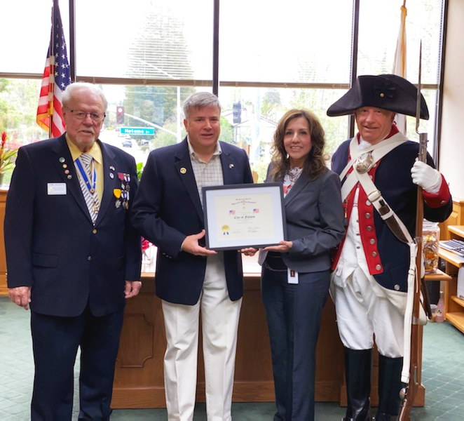 On April 11, 2023, Tom Douglas, secretary and a founding member of the Mother Lode Chapter, Steve Belden, president, and Don Littlefield, Sacramento Chapter, presented a framed SAR flag certificate to Folsom Mayor Rosario Rodriguez. The Mayor was thrilled with the occasion and hopes to invite the SAR back to a meeting of the Folsom City Council at a future date.
