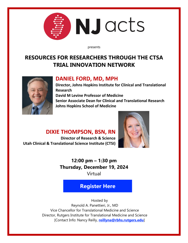 Their speakers are Dr. Daniel Ford from Johns Hopkins and Dixie Thompson from the University of Utah. Dr. Ford and Ms. Thompson will speak to our Rutgers Health community about the resources available to us through the CTSA Trial Innovation Network (TIN).