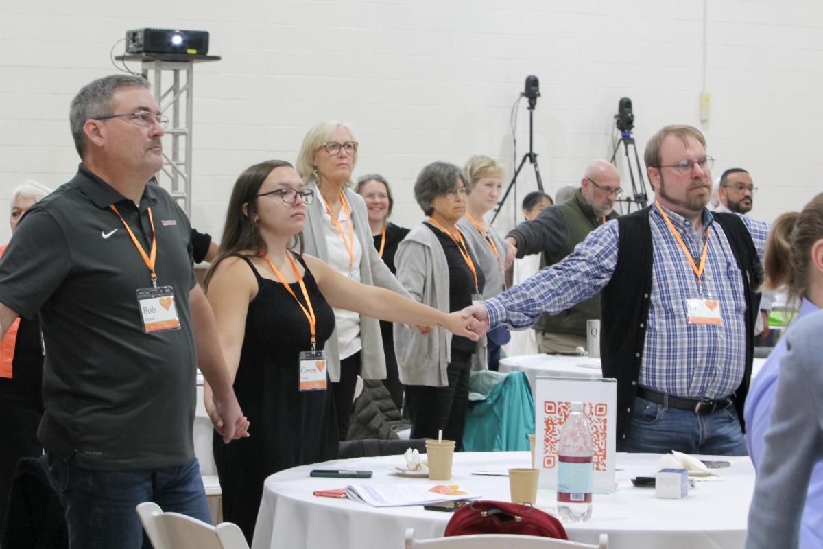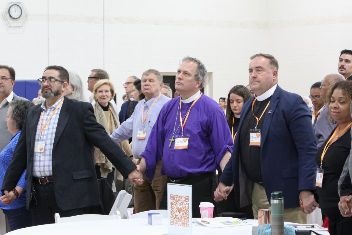 Delegates hold hands as Canon Loren Lasch led the Litany for the Mission of the Church at the